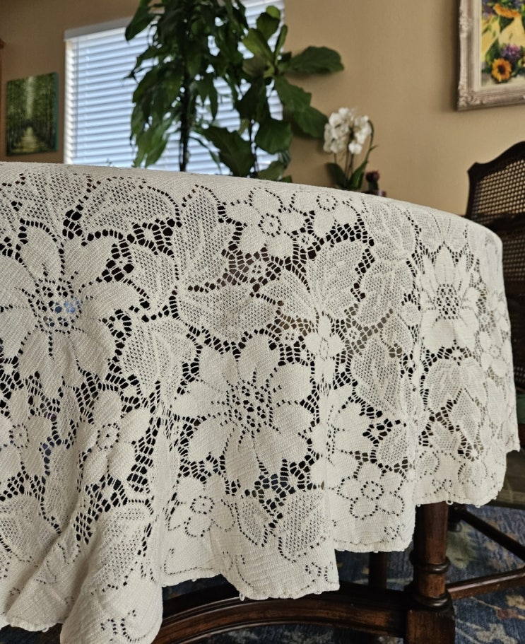 빈티지 미국 퀘커 Quaker 레이스 테이블 클로스입니다 아이보리 색상에 촘촘하고 화려한 패턴이 짜여 있어...