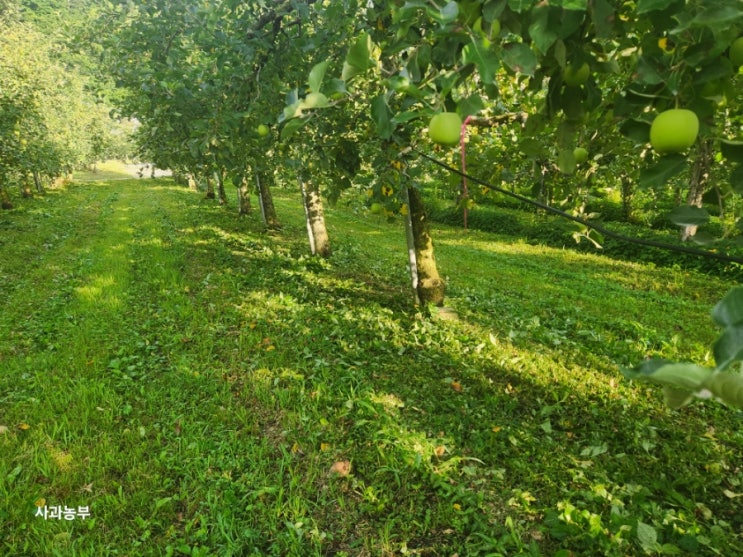 반사필름깔기전 예초기작업 추석때 수확하는 홍로사과 성질 급한 녀석들은 벌써 연분홍 립스틱처럼 볼 터지...