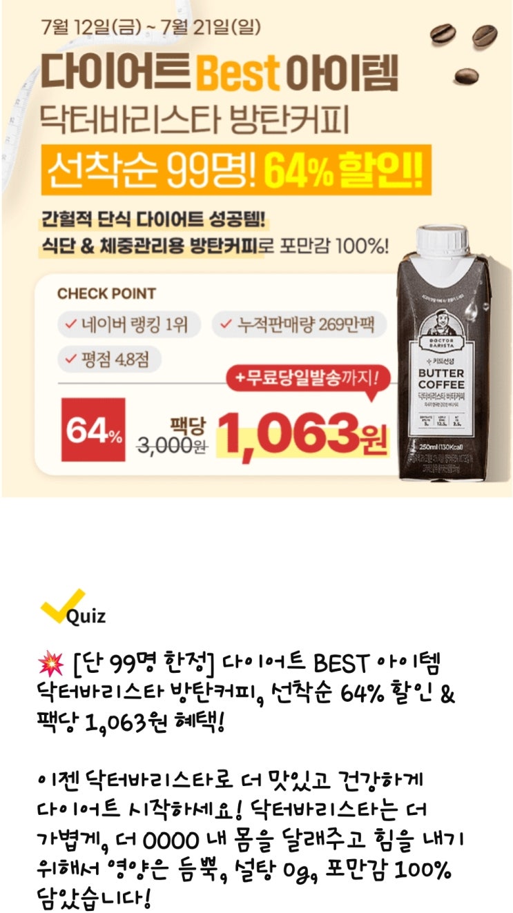 캐시워크 돈버는 퀴즈 7월 13일 방탄커피, 배민, 로봇 청소기, 떡볶이 소스, 칫솔, 공스킨, 바디미스트, 캐시닥