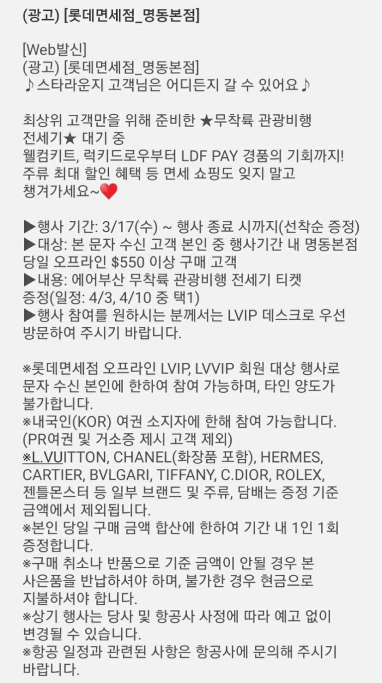 [Web발신] (광고)롯데면세점 주말에는, 패밀리세일DAY^o^♬ ▶명동본점 패밀리 SALE! ㄴ일시 : 7. 16(토) ~ 17(일) ① 1/3/6/10만원 금액 할인 ($100/200/400/800이상 구매시) ② 화장품/향수 할인 최대 40%! (SK2, L