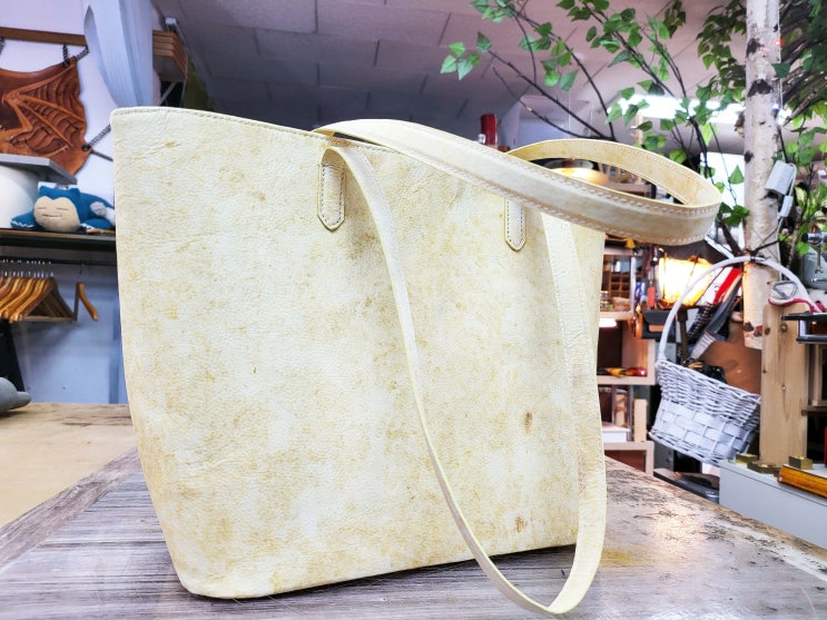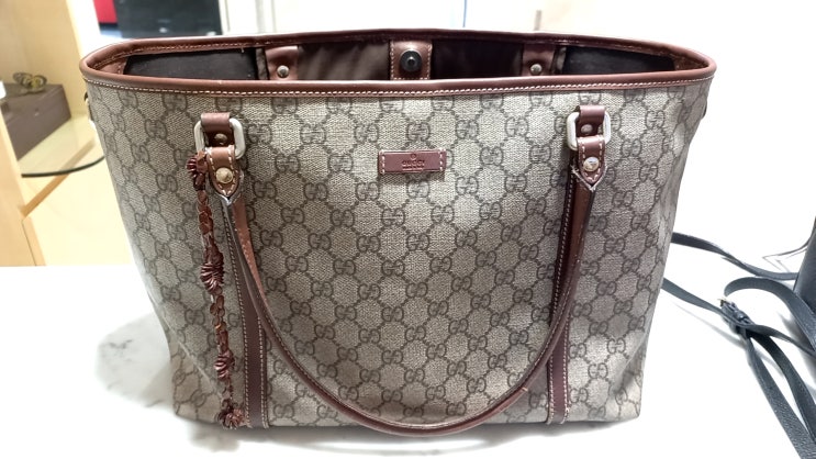 구찌 가죽 쇼퍼백 오래되어 탈색되고 갈라진 상단입구 테두리 바이어스 가죽 새 리얼가죽으로 교체수선 반...