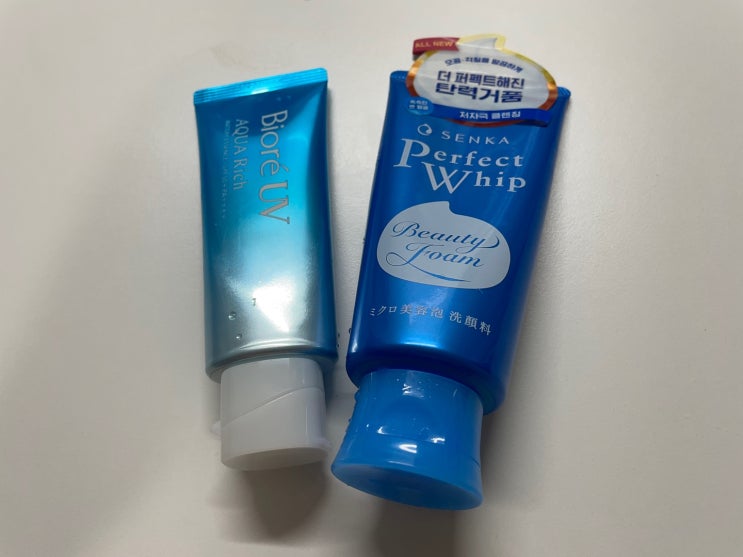 최근에 구매한 비오레 아쿠아리치 선크림과 센카 퍼펙트 휩 클랜징 폼. 장마가 끝난 이후로 거의 매일같이 ...