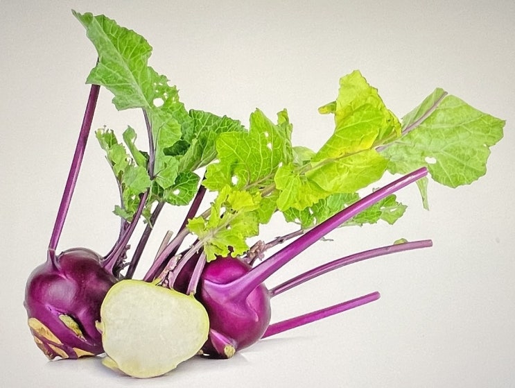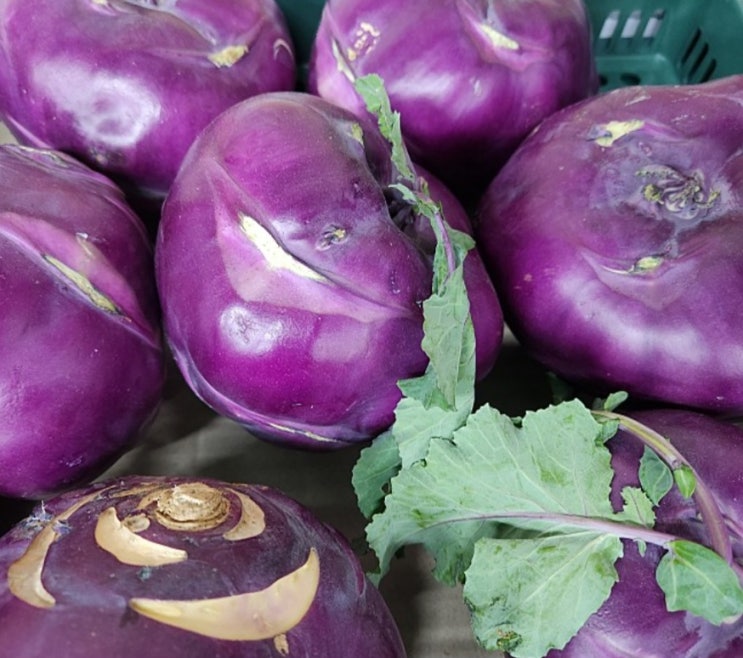 콜라비는 양배추와 순무를 교배한 채소로 뿌리 부분은 동그란 형태로 외관이 특이하며 아삭한 식감과 과일...