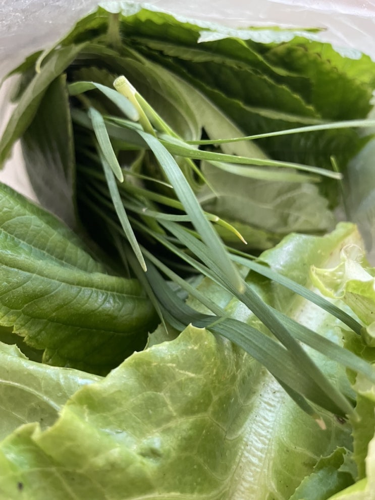 주말 농장에 가자마자 보이는 깻잎. 여전히 풍성하게 잘 자라고 있다. 부추도 이젠 제법 부추덥다. 씨뿌려...