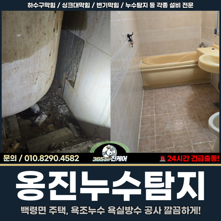 안녕하세요. 옹진누수탐지 업체 365설비진케어 인사드립니다. 요즘처럼 장마철이 되면 배관으로 물이 끊임...