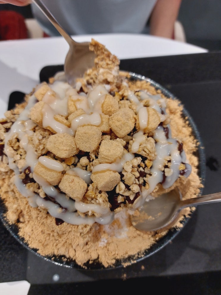 요즘 빙츄르 완전 인기 콩가루와 연유 그리고 견과류 토핑 듬뿍 올라간 인절미팥빙수 맛있겠땁. 마곡역 3번...