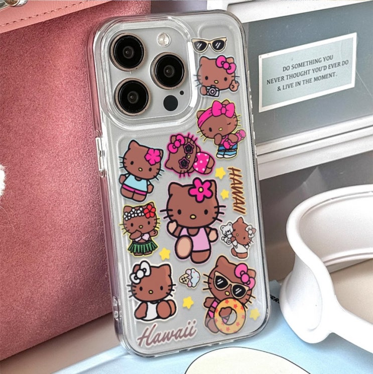 많은 사랑을 받고 있는 태닝키티 디자인의 투명 아이폰 케이스입니다 하와이에서 바캉스를 즐기고 있는 듯...