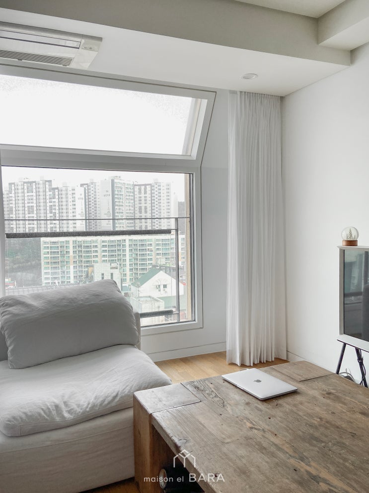 화이트 인테리어의 정석 / 약수 준아트빌 홈 스타일링 / 한남동 고급 빌라 펜트 하우스 인테리어 / 100% 암막 커튼, 허니콤 블라인드 / 지붕창 천장 커튼 시공 / 메종엘바라