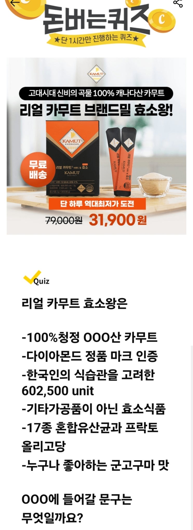 안녕하세요. 캐시프렌드입니다^^ 리얼 카무트 효소왕 3개월분 3g x 90포 캐시 캐시워크 모든 정답이 아래에...