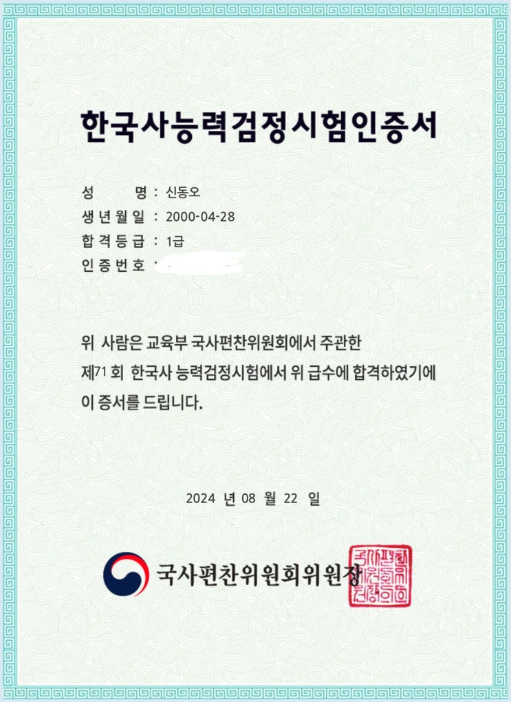1. 휴학 목표 두 번째 한국사능력검정시험 심화 1급 취득 이걸 목표로 뒀었던 이유는 지금은 접었지만.. 공...