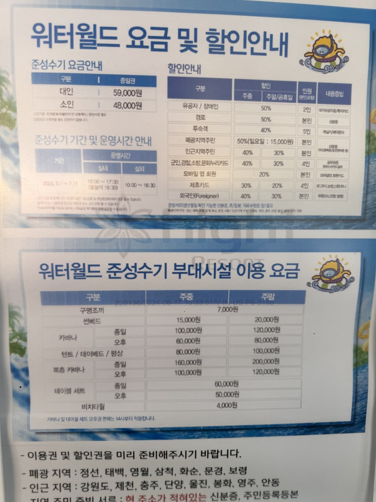 하이원 워터월드 할인(대인+소인)정보 준성수기 성수기 요금 및 푸드코트 안내