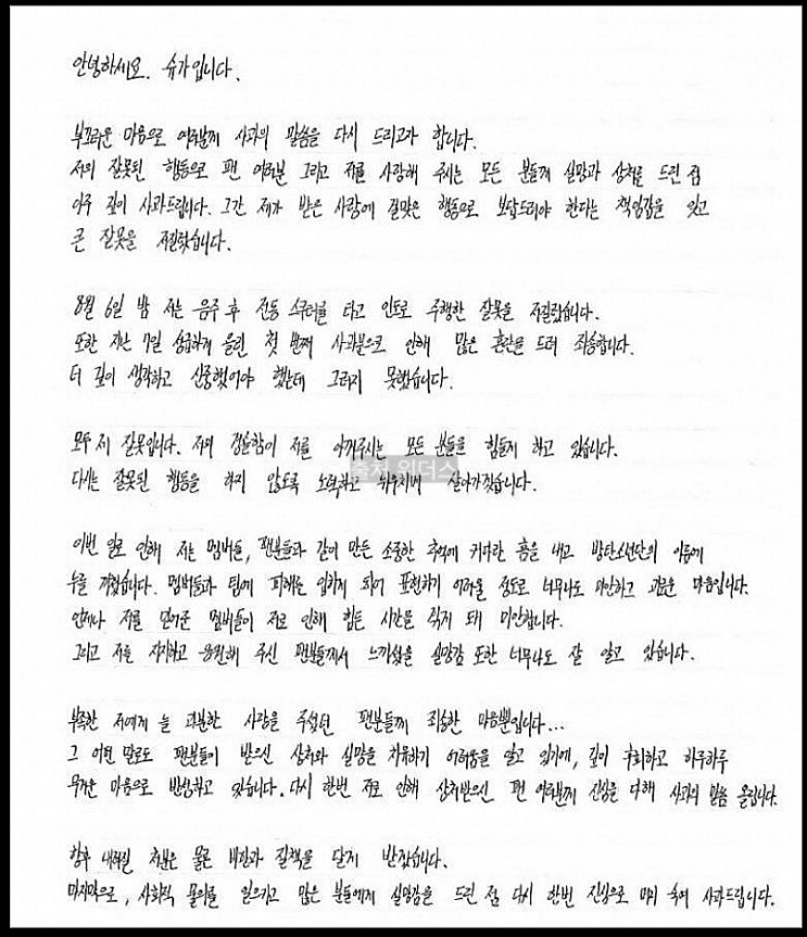 방탄소년단 BTS 슈가 자필 사과문 내용 전동킥보드 전동스쿠터 안녕하세요. 음주상태로 전동스쿠터를 운...