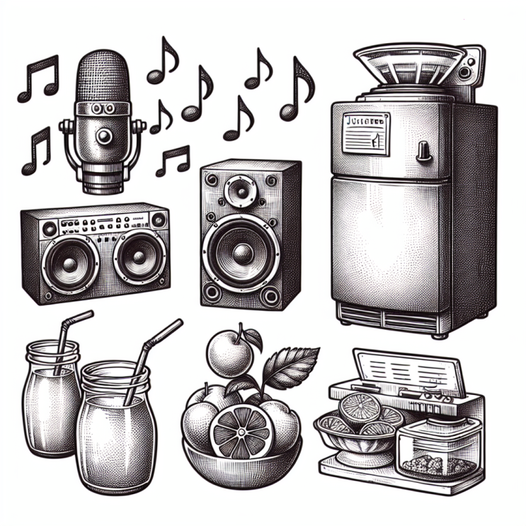 혼자 노래할 때 필요한 스피커와 주스기 그리고 음식을 신선하게 보관할 수 있는 냉동고의 이 혼자 노래할...