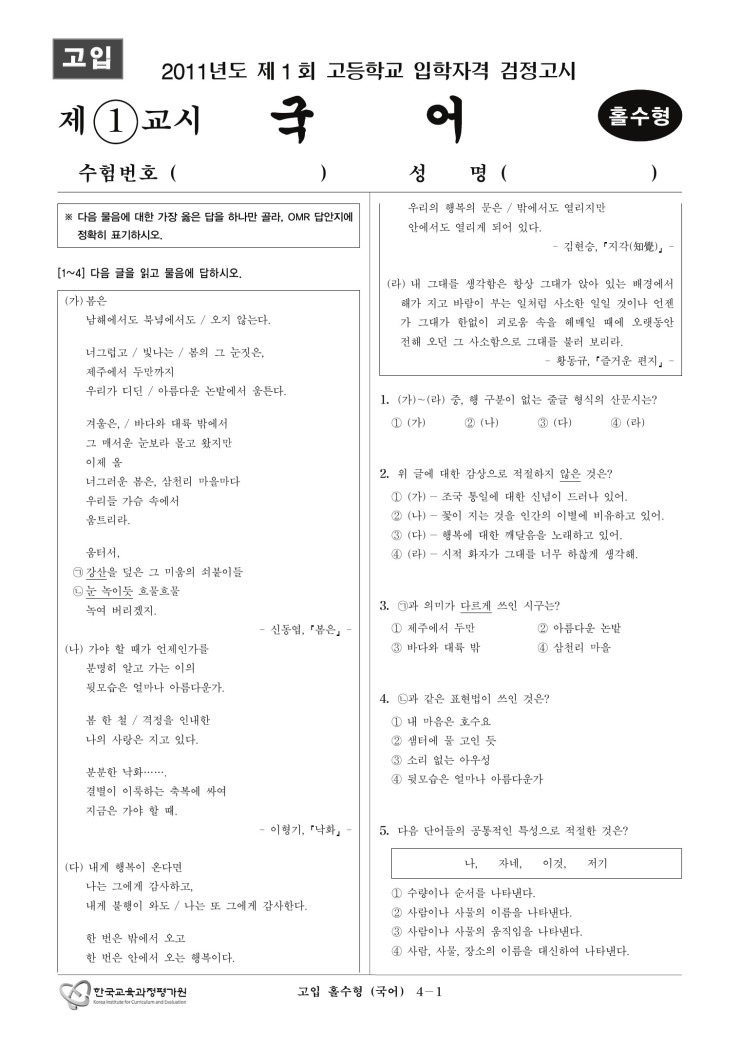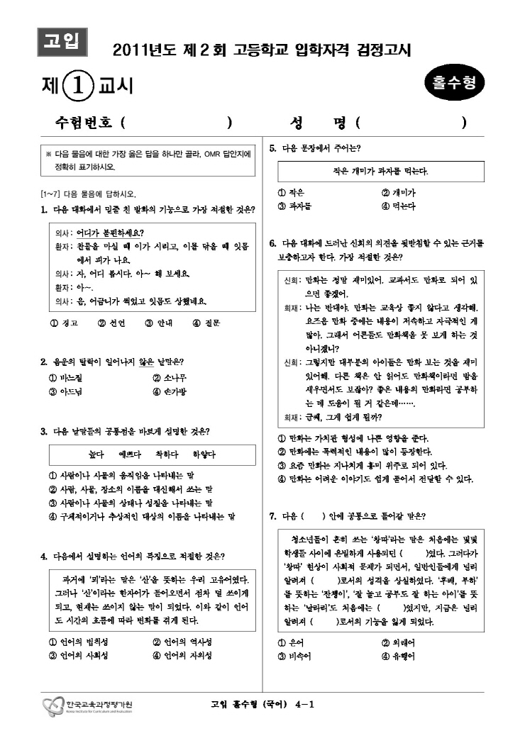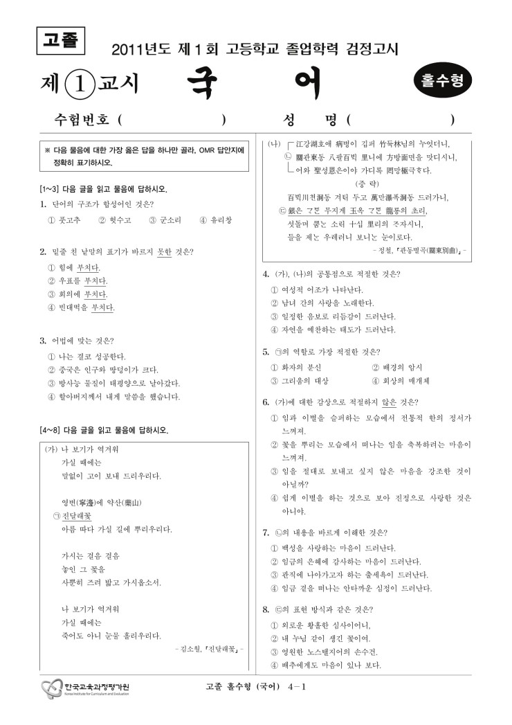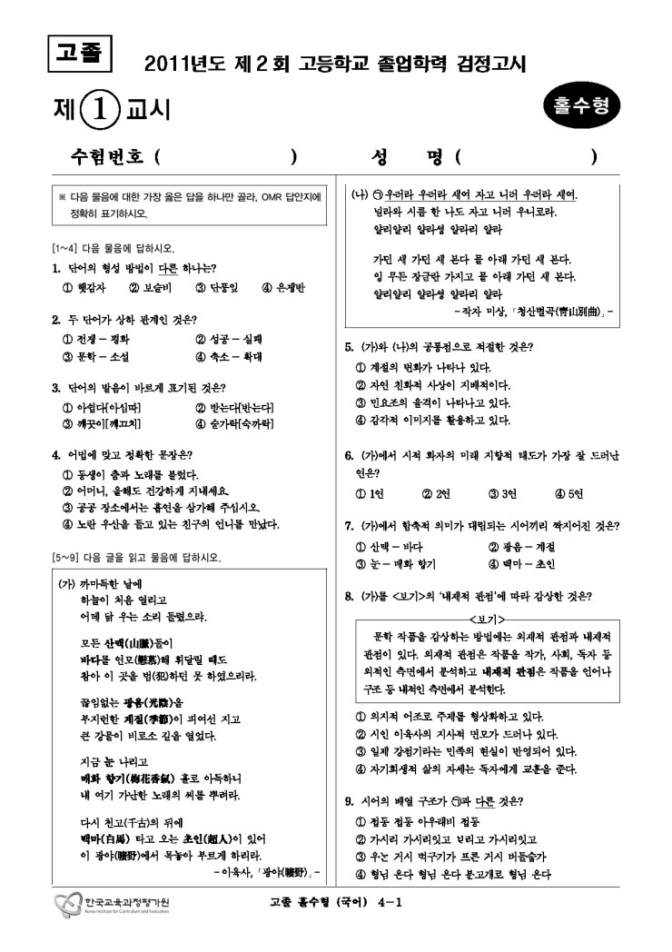 [검정고시] 대입 검정고시 기출문제 2011년 1회 홀수 국어
