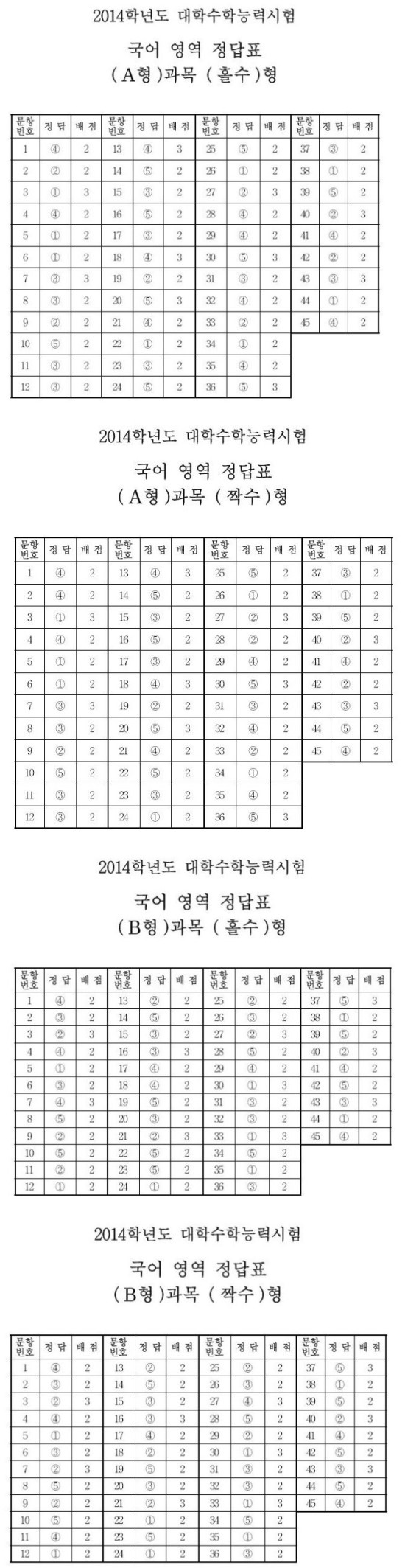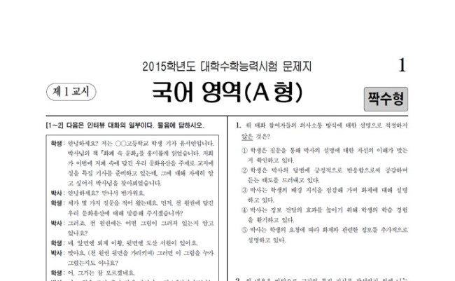 2015학년도 수학능력시험 국어 A형(짝수,홀수) 문제와 정답