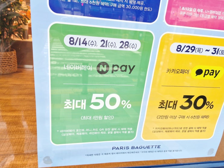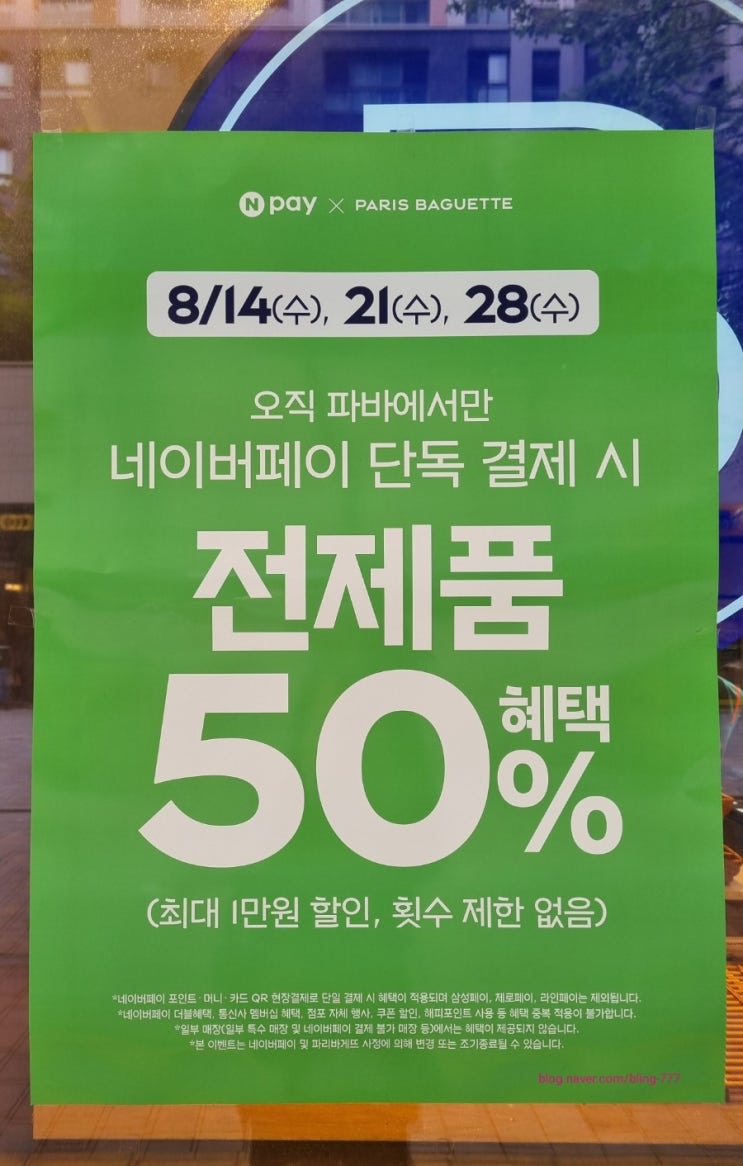 파리바게트를 네이버페이로 결제시 매주 수요일에 50% 할인하는 이벤트중이랍니다:) 저는 8/14일 수요일에 ...