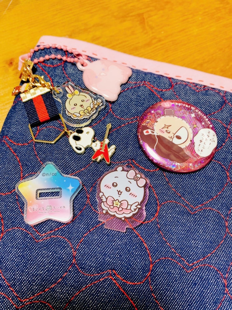 일본 인기캐릭터 디자인문구 치이가와 매지컬 치가와 팝업스토어에서 가챠가챠로 받은 아크릴스탠드 뱃지 굿즈 그리고 파우치에는 덕질굿즈로 인형을 넣어보기
