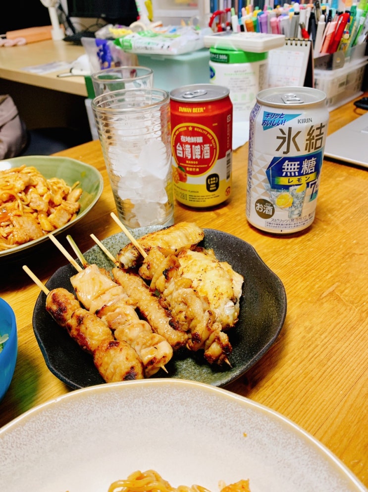도쿄일상 소소한 밥상 둘밥,, 소면어렌지 볶음 무침 김치말이 국수처럼 감밥 야키도리 타이완맥주 츄하이 등등