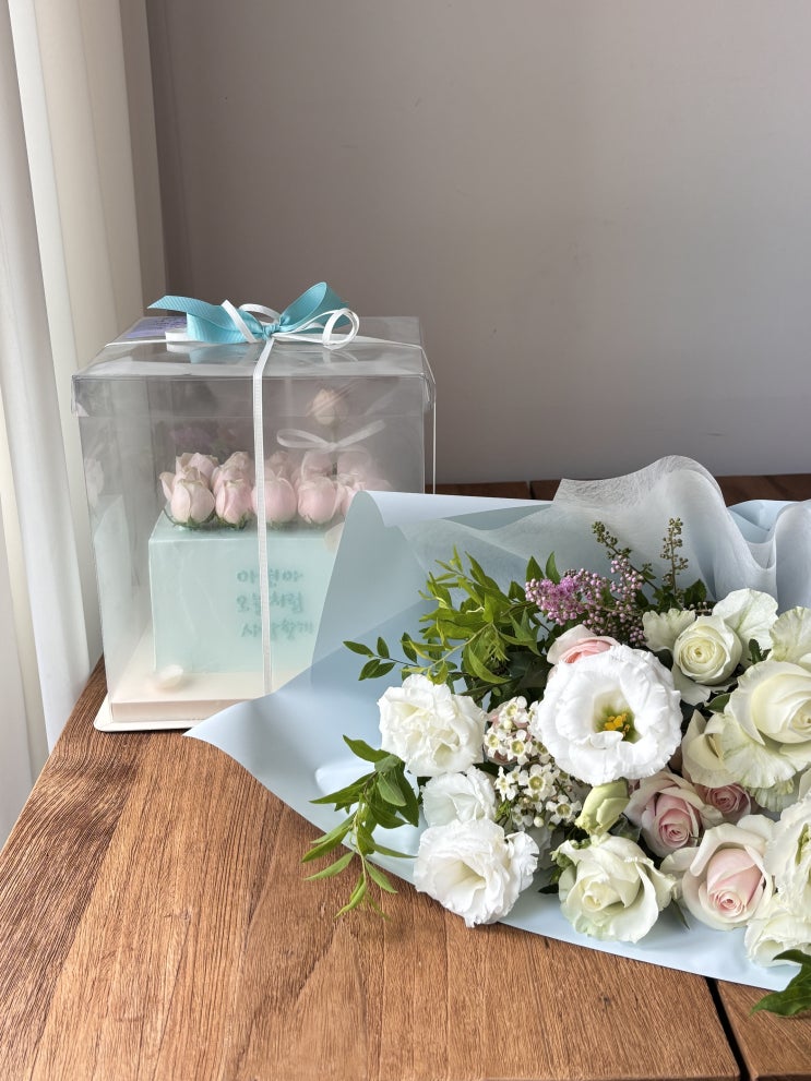 판교꽃집의 리시안셔스 프로포즈 꽃다발 & 케이크 '꽃말 영원한사랑'