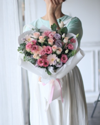 안녕하세요 한성대꽃집 클레망플라워 예요 L사이즈 리시안셔스&장미 꽃다발이예요 장미꽃다발은 사이...