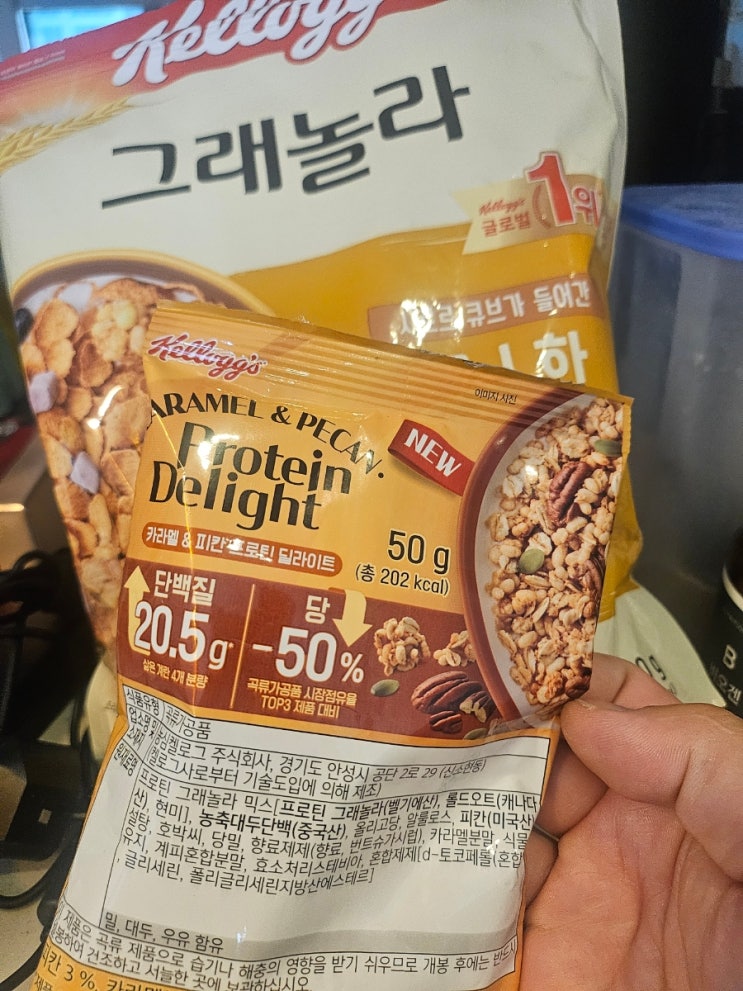 홈플러스 가서 장본날 #그래놀라 사면서 앞에 붙에있었던 증정용 샘플 세봉지 #카라멜앤피칸프로틴딜라이트...