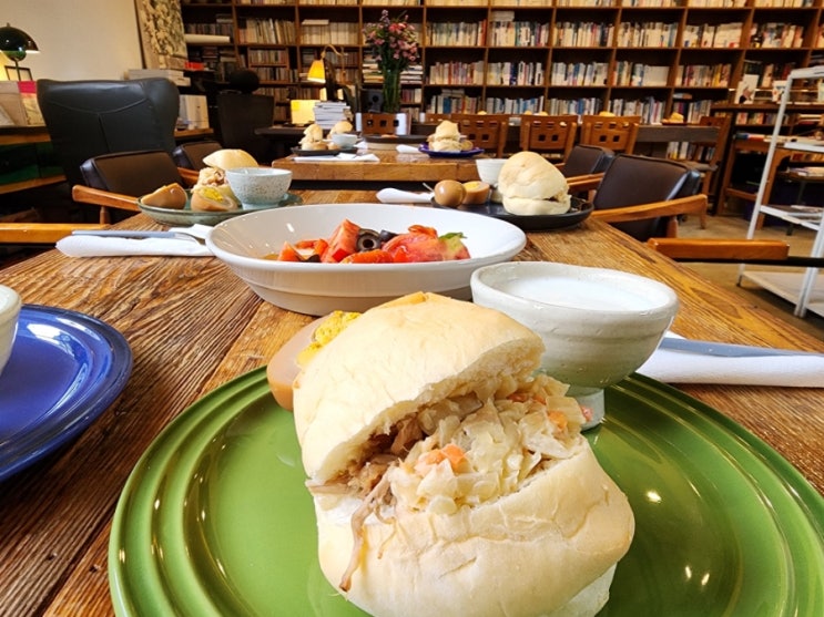 밭에서 바질을 따서 토마토를 볶았다. 풀드포크를 덜어 오븐에 살짝 데웠다. 샐러드를 곁들여 샌드위치를 ...