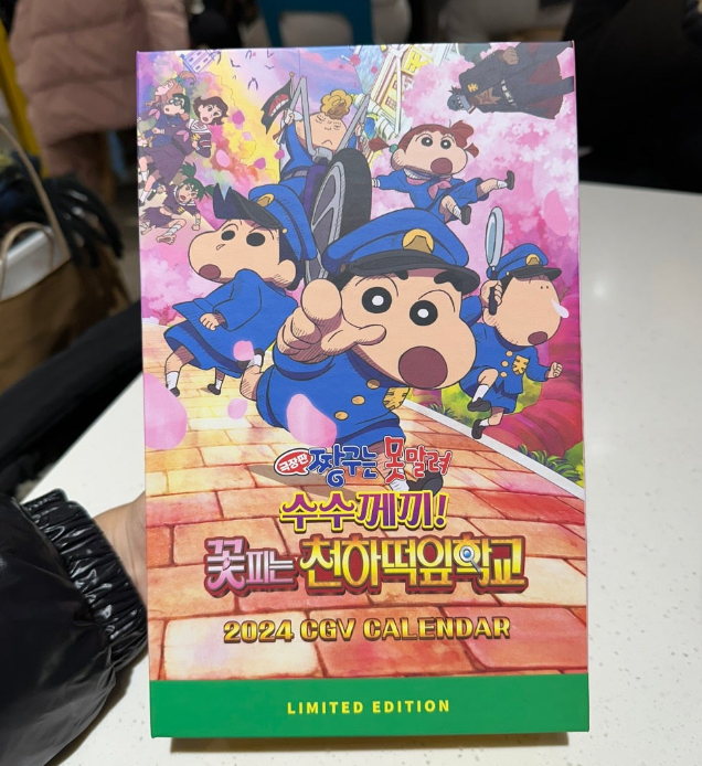 CGV에서 한정판 짱구 굿즈를 출시했다. 바로바로 2024년 달력 + 스티커 + CGV 쿠폰 구성! 12월에 짱...