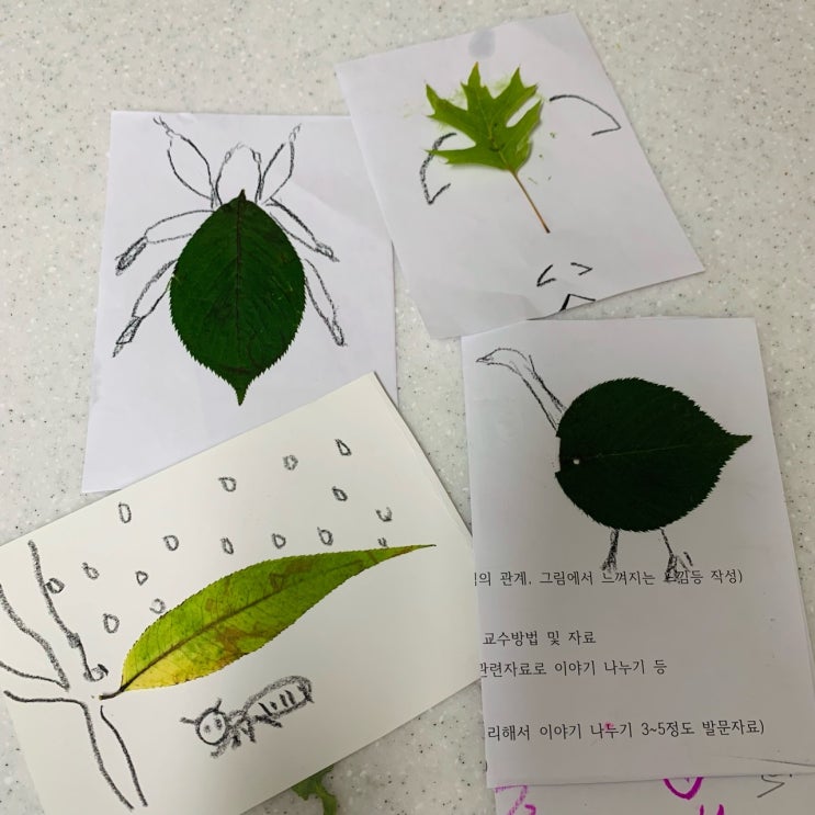 아이들 노는 틈에 놀이터를 산책하다가 나뭇잎 몇 장을 주워왔어요. 숲놀이 강의 들으며 나뭇잎에 눈 스티...