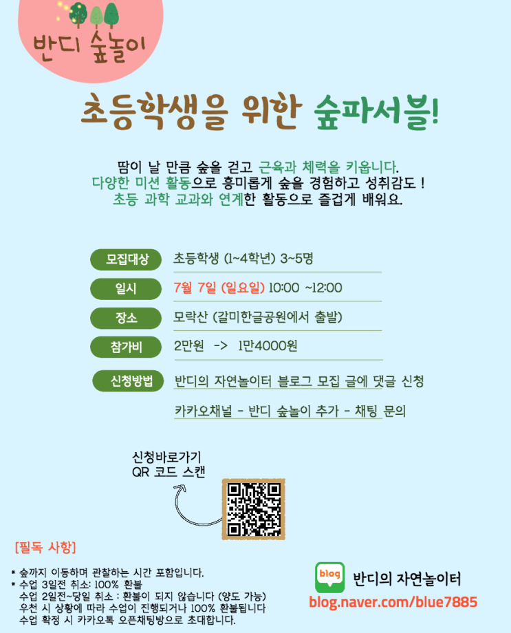 반디숲놀이에서 7월 숲체험 프로그램 참가자 모집합니다. 당분간 초등학생을 위한 숲파서블과 유아(보호자 ...