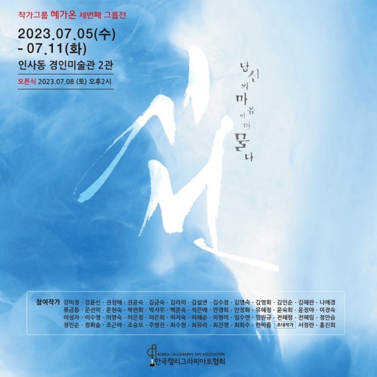 한국캘리그라피아트협회 그룹전 초대작가로 전시 참여하게 되었습니다. 인사동 경인미술관 2관에서 7월 5일...