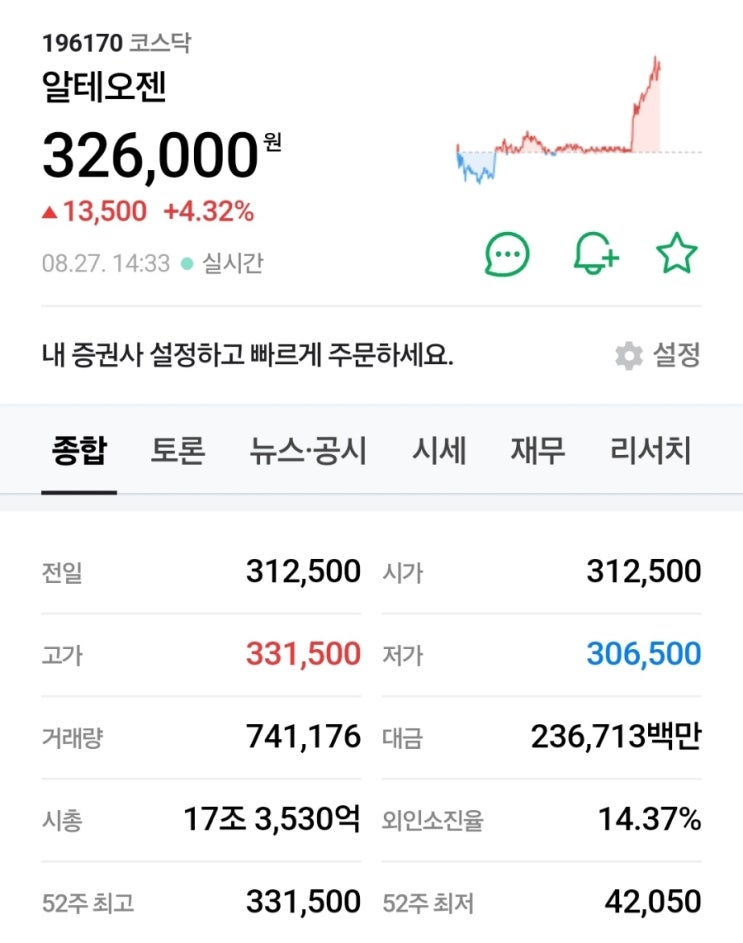 [1] 알테오젠 코스닥 시총 1위 등극 드디어(?) 알테오젠이 에코프로비엠을 제치고 종가기준 시가총액 1위로...