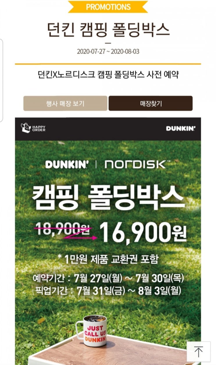 지인이 정보를 주네요 던킨도너츠 해피포인트 앱으로 7월27일부터 사전예약 노르디스크 캠핑 폴딩박스 준대...