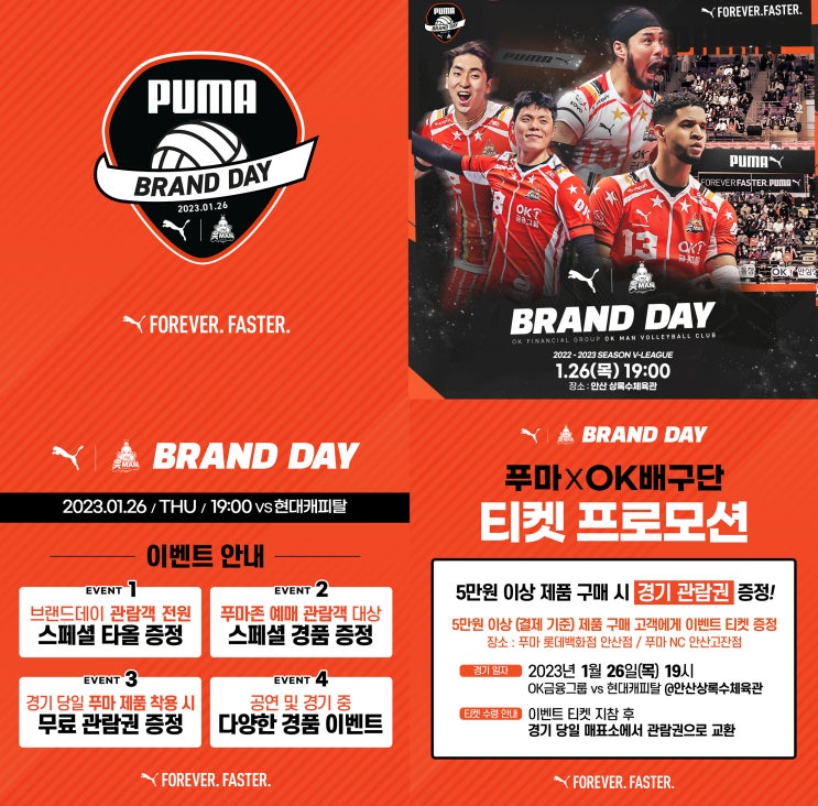 PUMA 푸마 브랜드데이! OK금융그룹 읏맨 배구단 안산 상록수체육관 V리그 배구와 함께해요