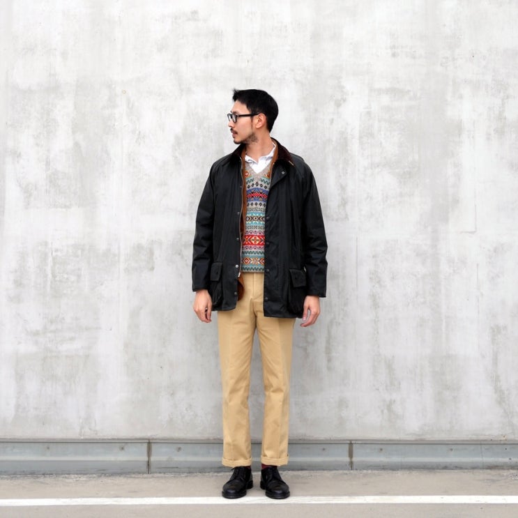 바버 뷰포트 세이지 자켓과 프레스콧 베이지 치노 팬츠 코디