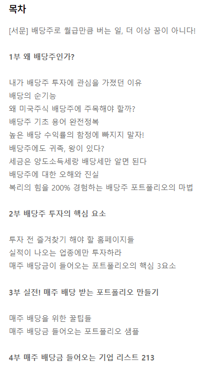 목차 1부 왜 배당주인가? 2부 배당주 투자의 핵심 요소 3부 실전! 매주 배당 받는 포트폴리오 만들기 4부 ...
