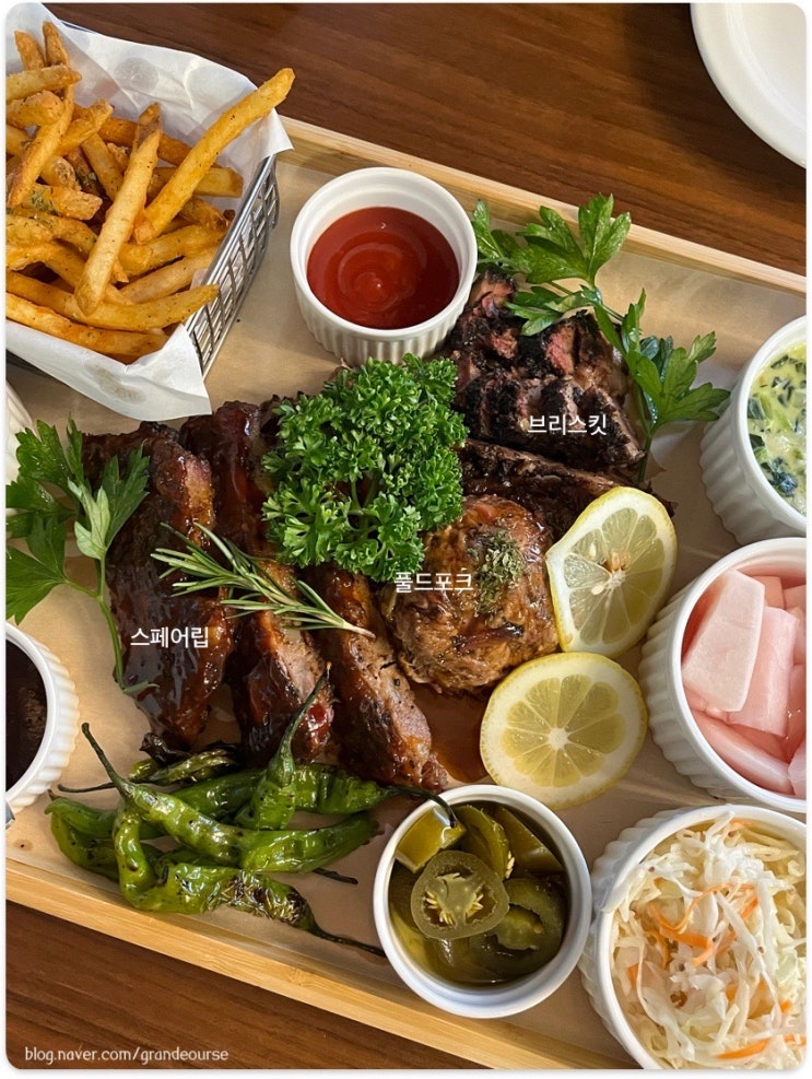 [덴스모크] 2인 플래터 (브리스킷 풀드포크 스페어립) 크림스피니치 맥앤치즈 | 세종 금남면