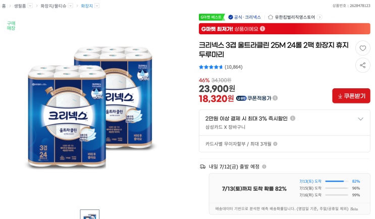 [18,320원] [지마켓] 크리넥스 화장지 핫딜! 크리넥스 3겹 울트라클린 25M 24롤 2팩 화장지 휴지 두루마리