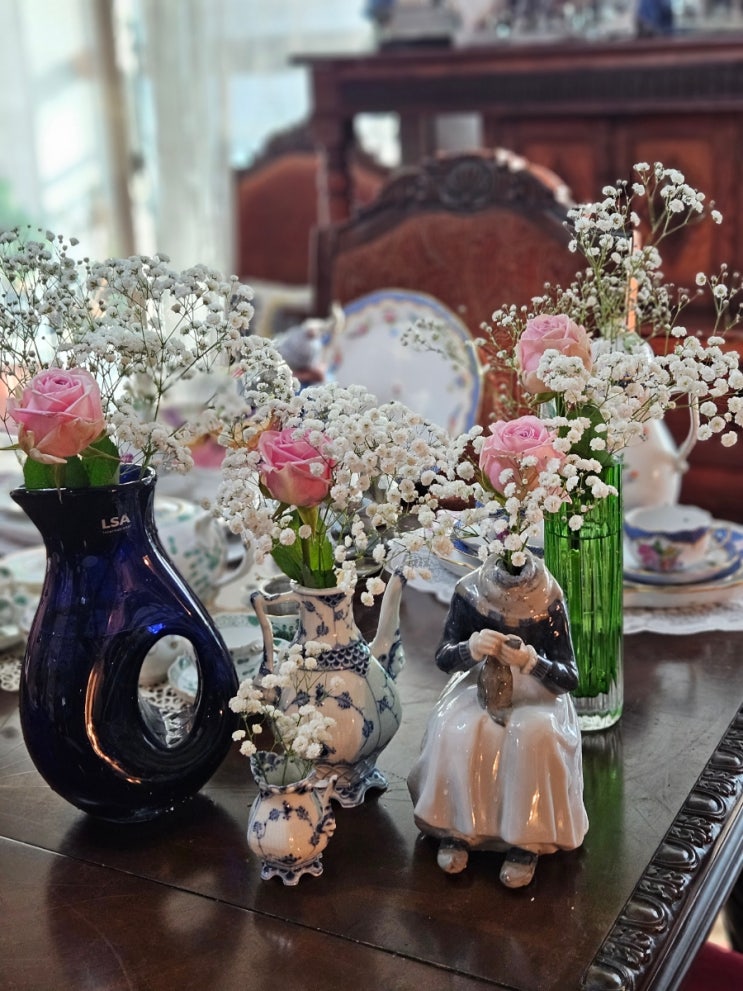꽃 한송이의 행복♡♡(마이센 그린 티타임, 쌤소나이트 캐리어, 핑크장미와 안개꽃.)
