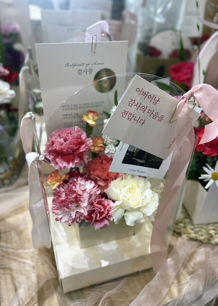 어버이날 꽃선물로 바구니는 많이 해보셨잖아요~? 감사장과 함께 드리는 세련된 꽃선물 어떠세요?