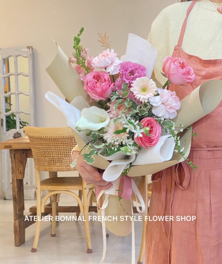 퇴직 꽃다발 어머니의 퇴직꽃다발을 준비해 드렸어요:) 핑크 계열로 잔잔하게??️ 주먹만한 사이즈의...