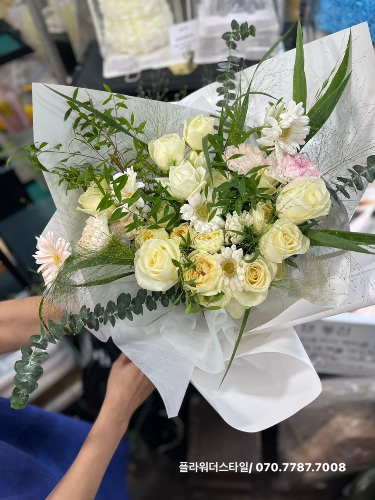 [화이트꽃다발]프로포즈꽃다발/기념일꽃다발/축하꽃다발/화이트&그린[일산주엽동꽃집플라워더스타일]