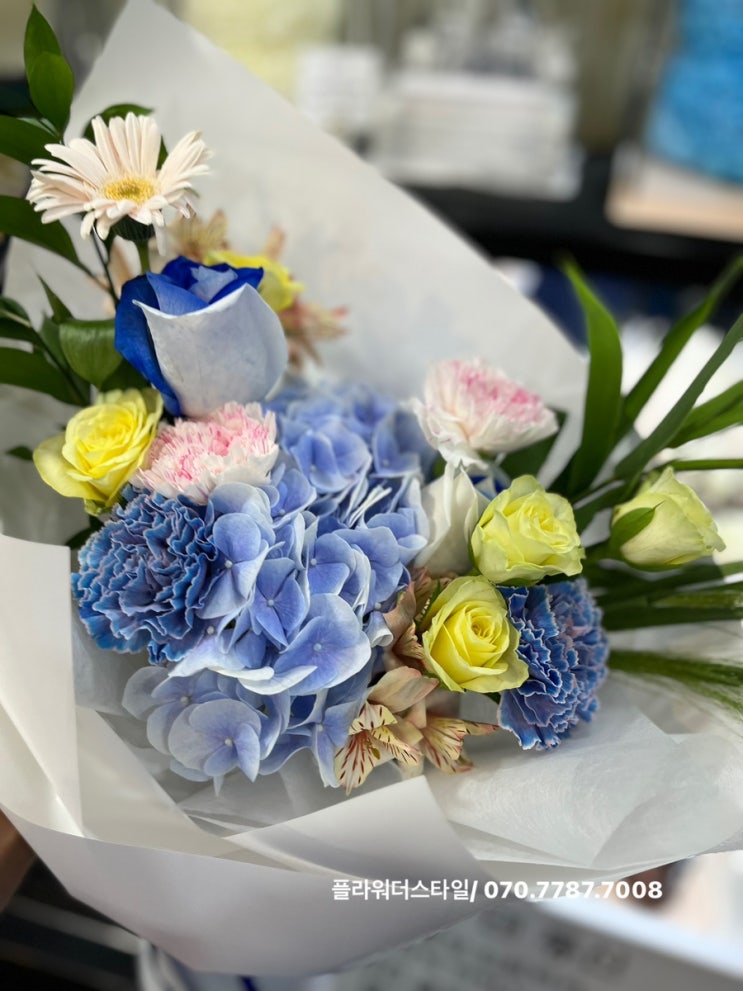 [블루 레몬색의 상큼한 꽃다발/수국꽃다발]블루수국꽃다발/주엽동으로 배송해 드린 꽃다발[일산주엽역꽃집플라워더스타일]