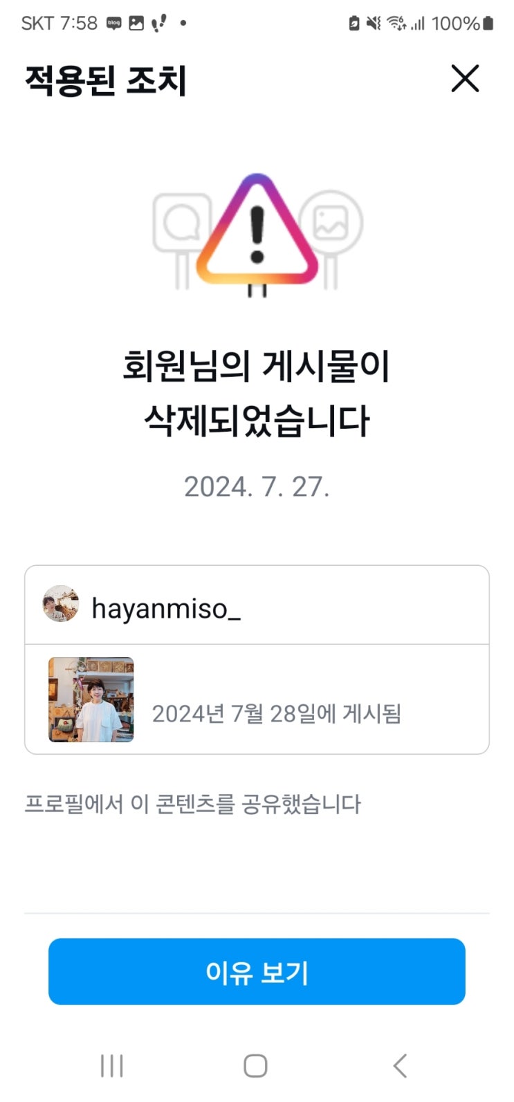 인스타 게시물 삭제 당했어요 벌써 열흘 해결방법 찾았어요