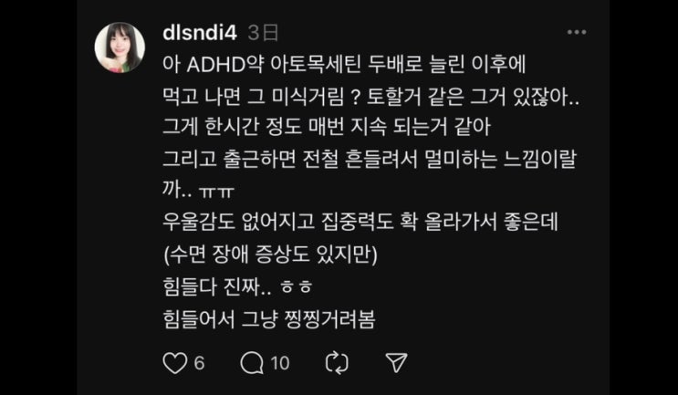 스레드에도 올렸는데 약복용마다 저 멀미하는 것 같은 기분 나쁜 증상이 있다,, 아토목세틴이 콘서타같은 ...