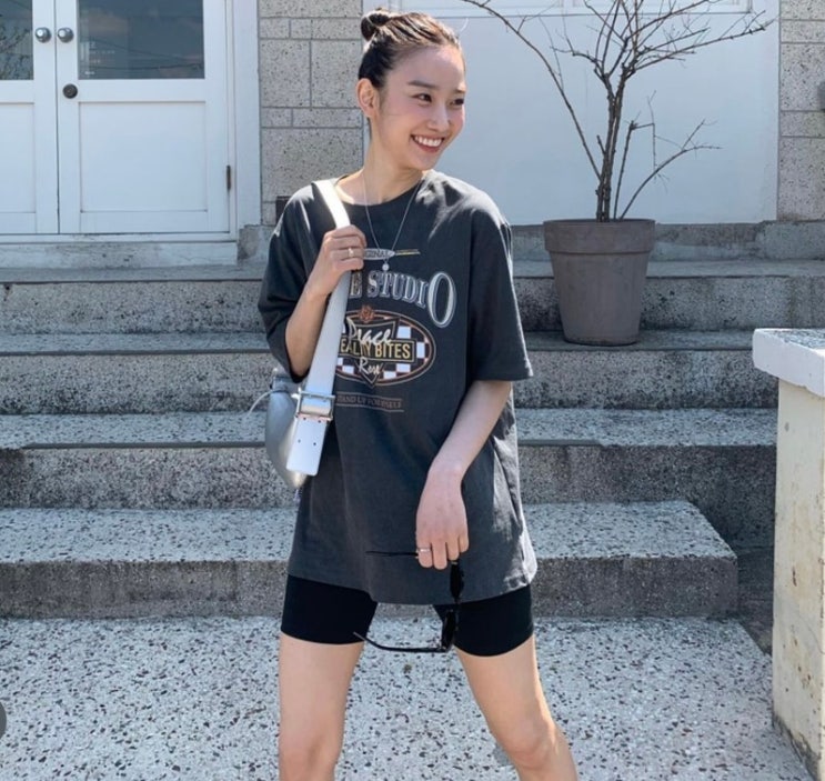 장희령 레이브 티셔츠 _ 여자 여름 티셔츠 추천 여유로운 핏의 티셔츠와 바이크팬츠를 착용하며 편안한 데...
