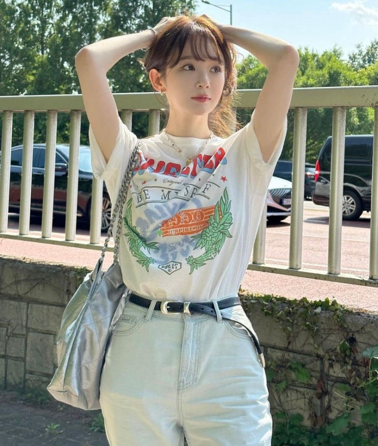 장희령 인스타그램 패션 레이브 티셔츠 & 실버백 가방, 드파운드 팬츠