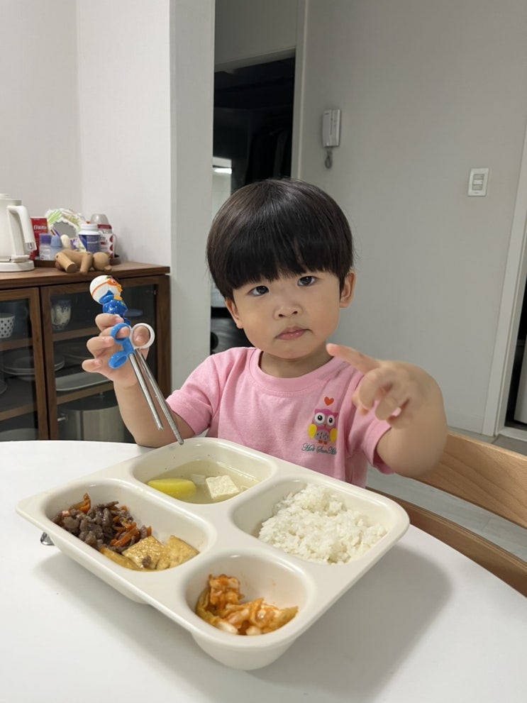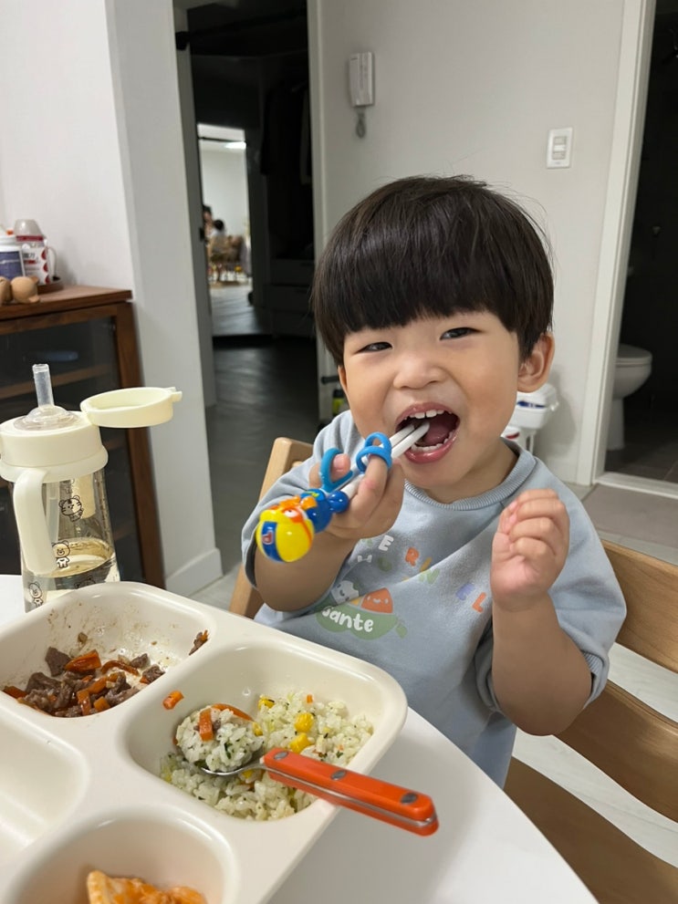 아침부터 일어나서 어제 놀던 기차놀이하고 남은 고기에 .. 주먹밥 만들어서 줬는데 얼른 자기 책상에 그릇...