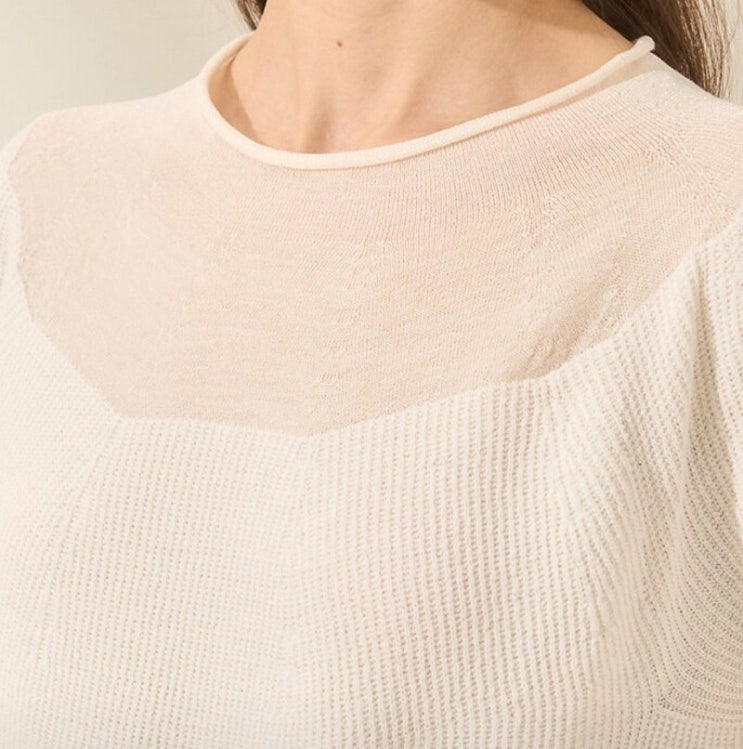 울블랜드 하프 슬리브 니트 탑 MN2D4-KTO267HD 상단에 내부가 비치는 시스루 텍스처를 블록하여 페...