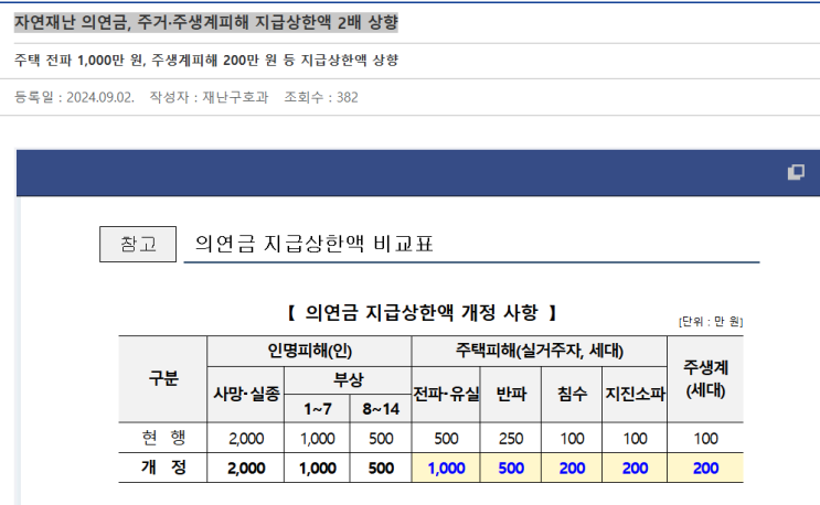 출처 : 행정안정부 24.9.2 보도자료 자연재난 의연금, 주거·주생계피해 지급상한액 2배 상향 | 행정안전부&...