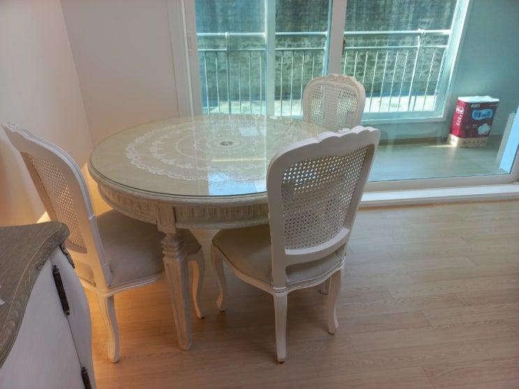 타원형 화이트 러스틱쉐비 식탁입니다~실제봄 고급지고 사랑스러운 쉐비식탁 이랍니다~ 의자는 크로이,라탄...